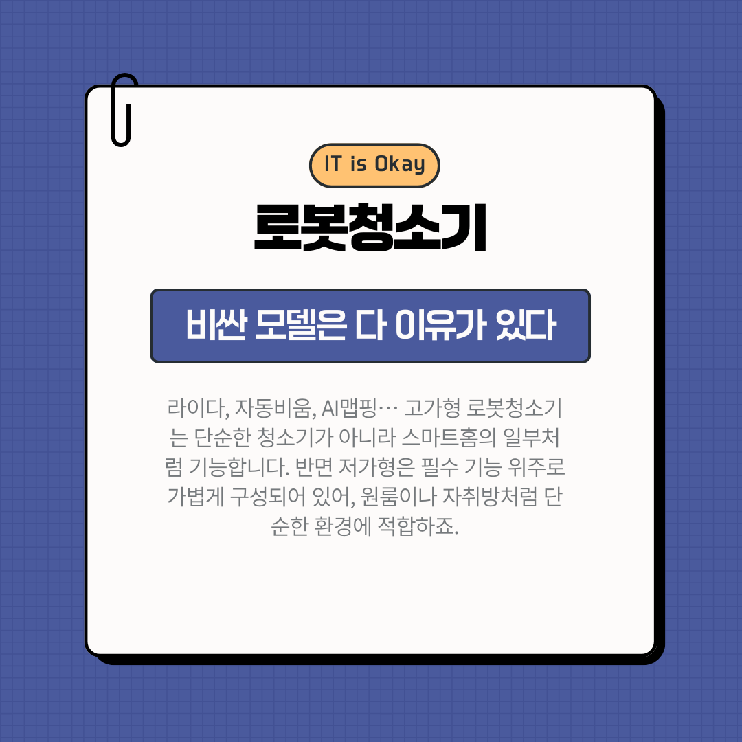 고가형 한 대 값이 아깝다고요? 일주일 2시간 청소하던 걸 로봇이 대신하면 연 100시간 아낍니다. 시급 1만5천 원으로 계산해도 3년이면 450만 원 상당이죠. 결국 “적당히 편한 데 쓰느냐, 완전히 맡기느냐”의 선택 문제일 뿐, 고급형이 과소비라고 단정하기엔 애매합니다.